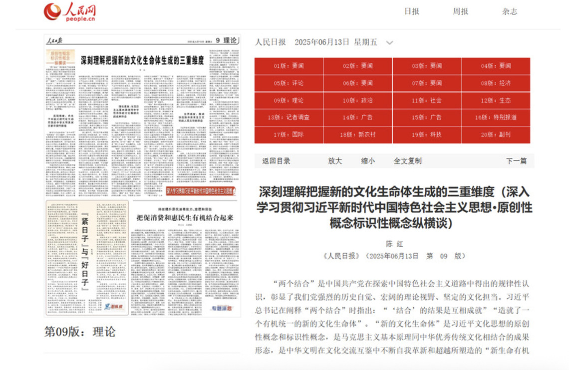 6月13日,人民日报报道我校陈红教授的文章《深刻理解把握新的文化生命体生成的三重维度》,文章从概念基点出发,循实践之迹、溯学理之源、答世界之问,梳理明晰新的文化生命体生成的内在逻辑,帮助我们从“点”到“线”、由“线”及“面”,深入理解和领悟习近平文化思想的这一重要范畴。