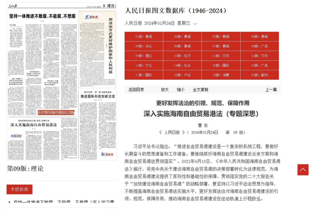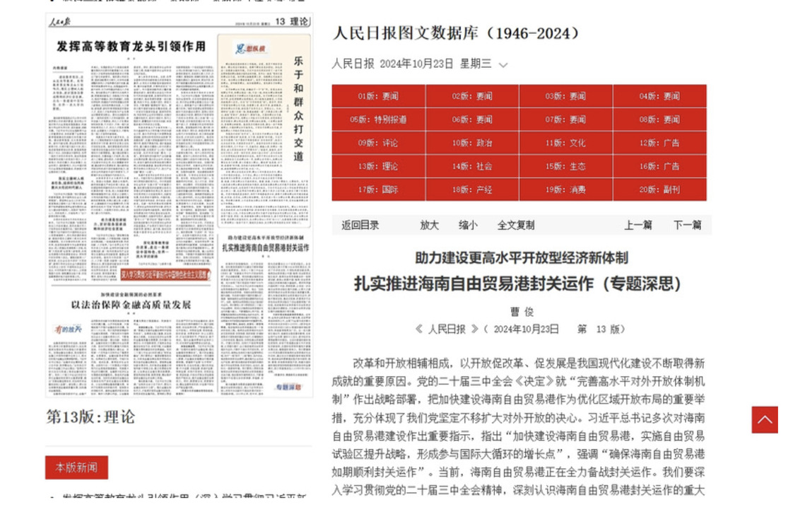 1月24日、10月23日,《人民日报》理论版先后发表我校法学院老师曹俊《深入实施海南自由贸易港法(专题深思)》《扎实推进海南自由贸易港封关运作(专题深思)》理论文章。