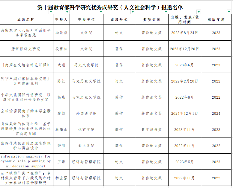 根据《教育部办公厅关于第十届教育部科学研究优秀成果奖(人文社会科学)申报工作的通知》(教社科厅函〔2025〕12号)等文件要求,经校内评审,现将报送名单进行公示。公示时间为2025 年11月7日至2025年11月11日。公示期间如有异议,可以书面形式并署真实姓名和联系方式,于公示期结束前(11月11日17:30前)发送至邮箱:hssk2019@126.com,以便调查核实。