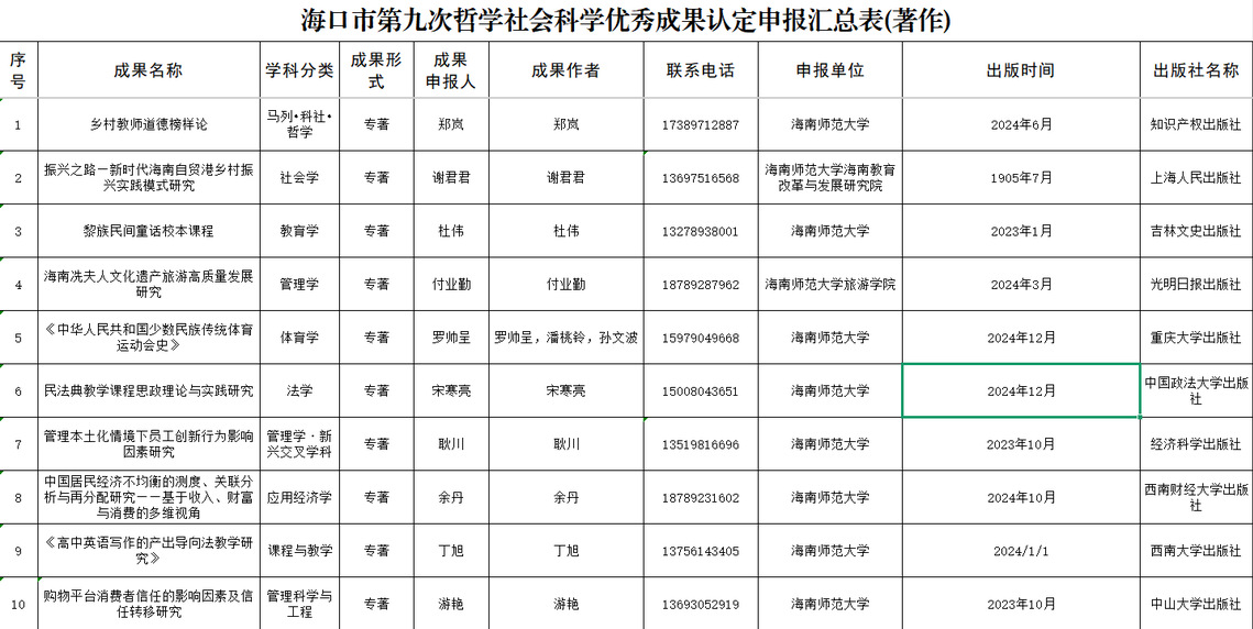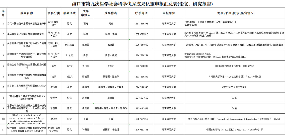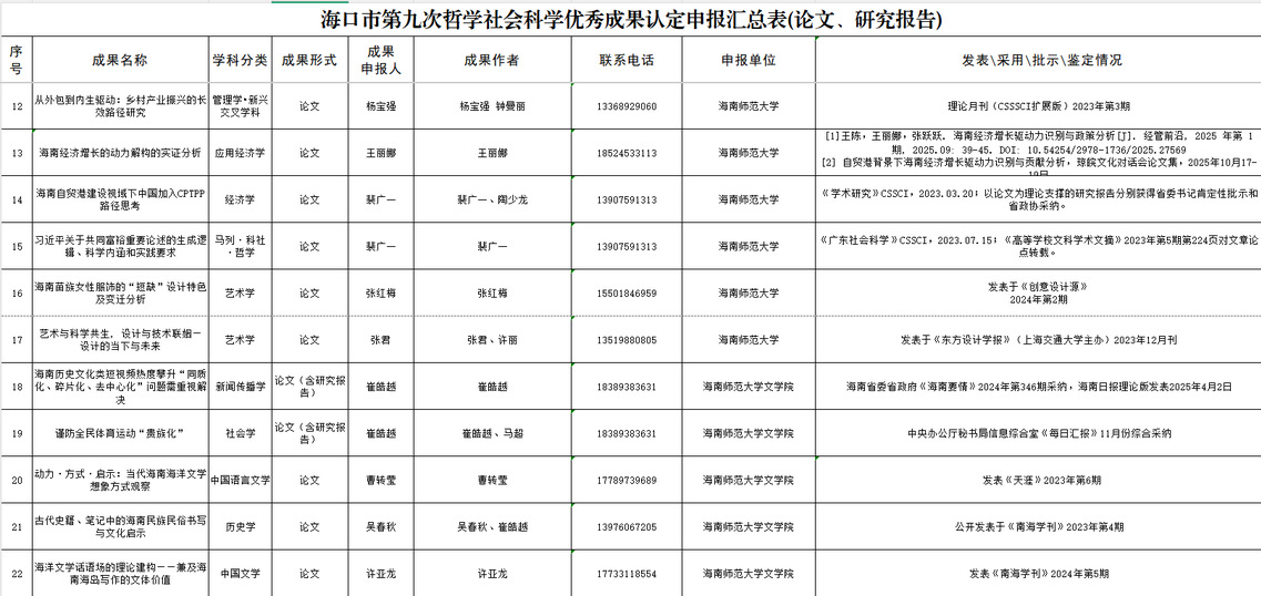 根据<<海口市哲学社会科学优秀成果认定办法>>(海宣通[2025]21号)有关规定,现将报送名单进行公示。公示时间为2025 年12月29日至2026年1月9日。公示期间如有异议,可以书面形式并署真实姓名和联系方式,于公示期结束前(1月9日17:30前)发送至邮箱:hssk2019@126.com,以便调查核实。