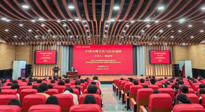 学术活动 12月27日下午,法学院“书香法苑”系列讲坛第8期在桂林洋校区图书馆一楼报告厅举行,特邀最高人民检察院咨询委员会副主任、教育部高等学校法学类专业教学指导委员会主任徐显明教授作题为《中国式现代化与法治道路》的专题报告。校长聂清斌,党委常委、副校长杨兹举出席报告会。会议由杨兹举主持。